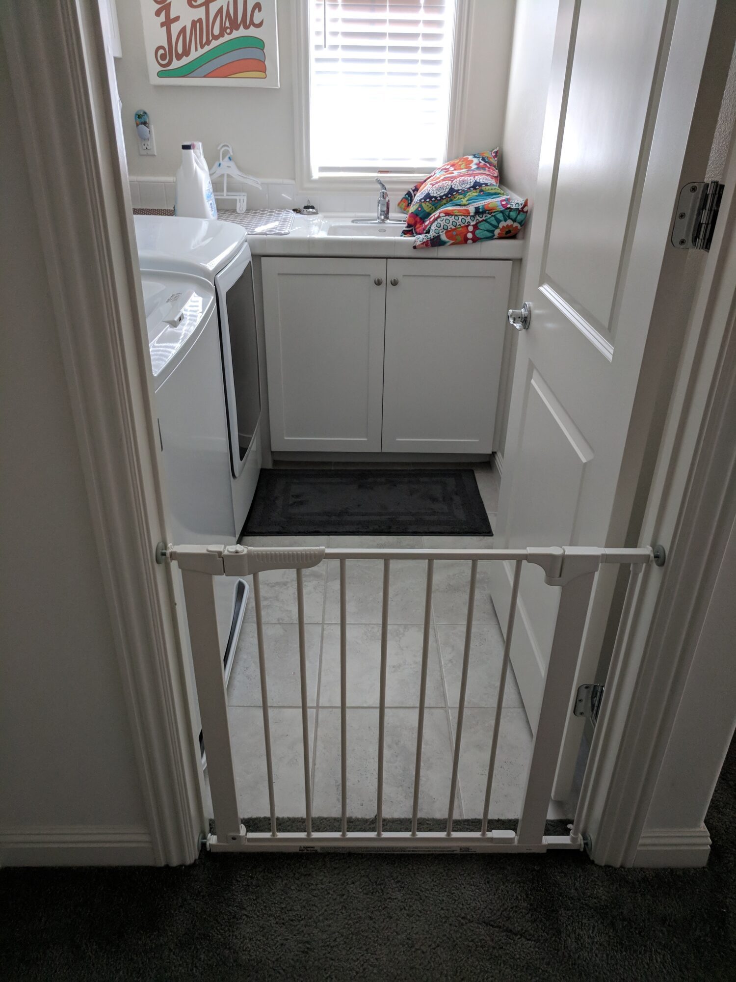 This top-rated, pressure-mounted, walk-through gate installs quickly. The U-shaped frame stays firmly in place while the center walk-through door swings in either direction.